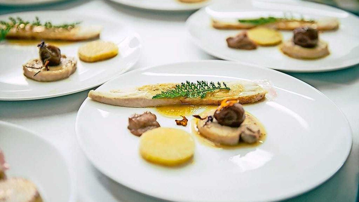 Gastgeber Hans Peter Fink zeigte, wie man nach dem Vorbild der japanischen Salzpflaumen (Umeboshi) Kriecherl fermentieren kann. Die fermentierten Früchte dünstete er in Butter an, passierte sie und versetzte sie mit einem Hühnerfond. Damit würzte er seine gebratene Hühnerbrust und ergänzte das Ganze mit Topinambur.