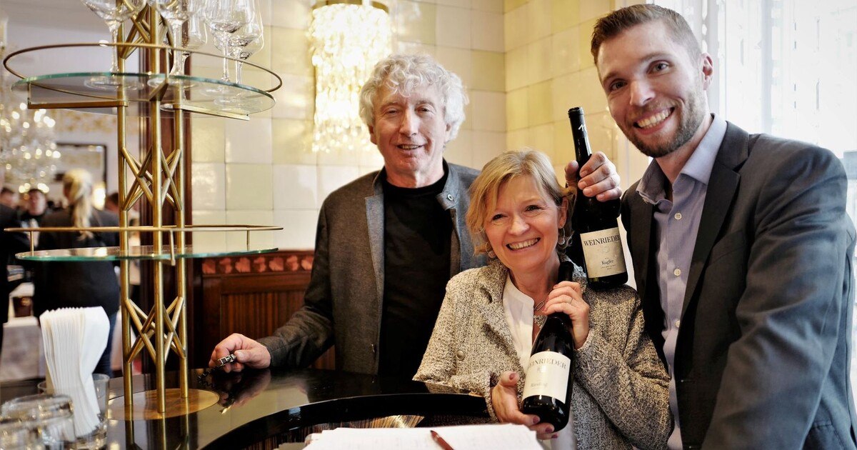 Melanie und Bernhard Rieder hatten bei den Tischpräsentationen auch eine Neuheit parat, den in Kaltmazeration gekelterten „Lukas“, der die Hausvariante eines „Orange Wines“ darstellt. Doch weniger der Gerbstoff, sondern die extrahierte Frucht – ÖGZ-Kostnotiz: „dicht und tropenfruchtig wie ein Mangosaft“ – beeindruckte bei diesem Veltliner von Lukas Rieder. Freunde aus dem Weinviertel wie „Kurvnbräu“-Macher Roland Nestler fanden den Weg zur Verkostung ebenso wie Kollegen (Günther Neukamp) und natürlich Sommeliers – von Palais Coburg abwärts. Und natürlich durfte zwischen Lagen-Reserve „Kugler“ und dem stets überraschenden Riesling Eiswein „Schneiderberg“ der Schmäh nicht fehlen. Getreu Fritz Rieders Credo: „Ich will kein Süppchen, ich will eine Consommé“!