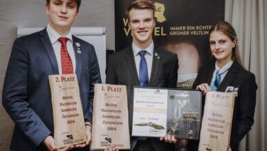 Bild oben: Junge Sommelier-Talente auf dem Podest (v.l.): Paul Harms, Schüler der HLTW 13 Bergheidengasse, Platz 2; Georg Damberger, Landhaus Bacher, Platz 1 und „Bester Nachwuchssommelier Österreichs 2024“; Lara Langeder, Platz 3, Schülerin Modul. Stockerlplatz Nummer 1 konnte sich Georg Damberger vom Landhaus Bacher holen, dicht gefolgt vom Wiener Schüler Paul Harms sowie Tourismusschülerin Lara Langeder. „Es ist sehr beeindruckend, das große Wissen und die Leidenschaft unserer Nachwuchssommeliers bei diesem Wettbewerb zu erleben“, findet die Geschäftsführerin des Gastgebers Weinviertel DAC Maria Obermayer lobende…